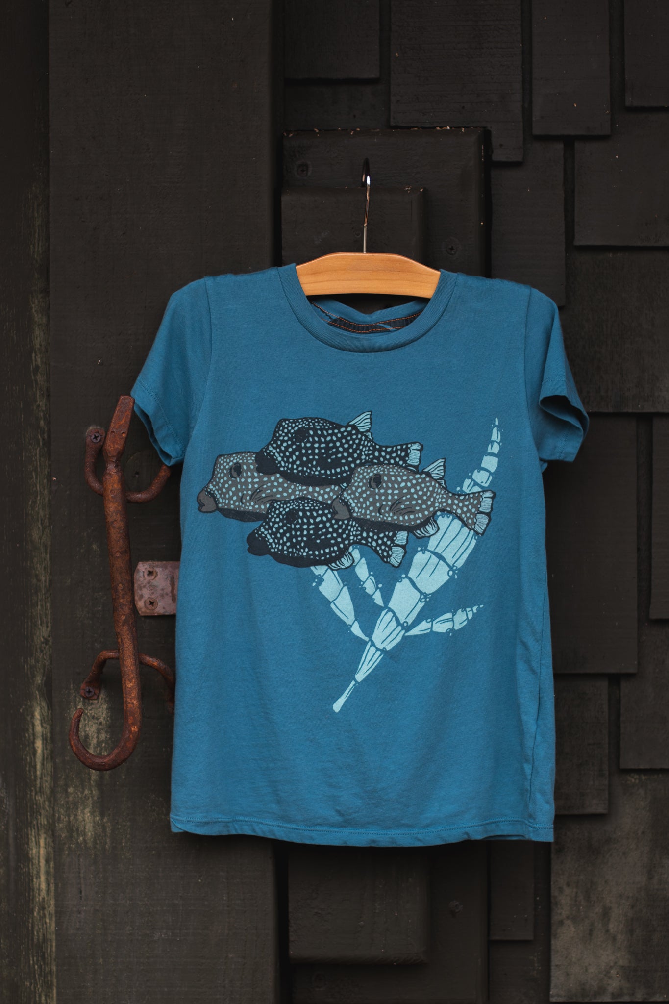 The forests and the oceans of Hawaiʻi teem with life. There are well over a thousand species of fish that occur in our islands and 20% of the reef fish are endemic. Along with the many delicious species of reef fish—a critical part of the Hawaiʻi diet—there are a handful of species that seem mostly decorative. One of these is the moa fish (aka pahu, spotted boxfish, Ostracion meleagris). A mostly peaceful reef dweller that typically grows up to six inches, the moa fish feeds on limu and tiny marine organisms. The boxy shape of its body is formed by fused scales and it’s beautifully covered in small dots. Moa color schemes and patterns were gifted by Kāne and Kanaloa, who gave all the fish their colors and markings. This account inspired the ʻōlelo for this design: Kikiko ʻia i ka nani o ka lipo - Marked in the beauty of the depths. Not just for the ocean, the term lipo in ʻōlelo Hawaiʻi also extends to the depths of the forest, the home of the other species featured here: hulumoa (aka kaumahana, Korthalsella latissima, or Hawaiʻi mistletoe). This herbaceous, parasitic plant grows on host trees (lama, koaiʻa, ʻolopua, kōpiko, ʻōhiʻa, koa). It has a “highly reduced” form (well under a foot tall) and is mostly flattened stems. At the nodes in the stems it bears clusters of tiny, also reduced flowers that give it the appearance of having spots as well. Linked in name and form, these two species may not be as large and well known as other Hawaiʻi organisms, but they play their own important roles in the ecosystems of sea and land; humble kūpuna in the wider ʻohana of life.